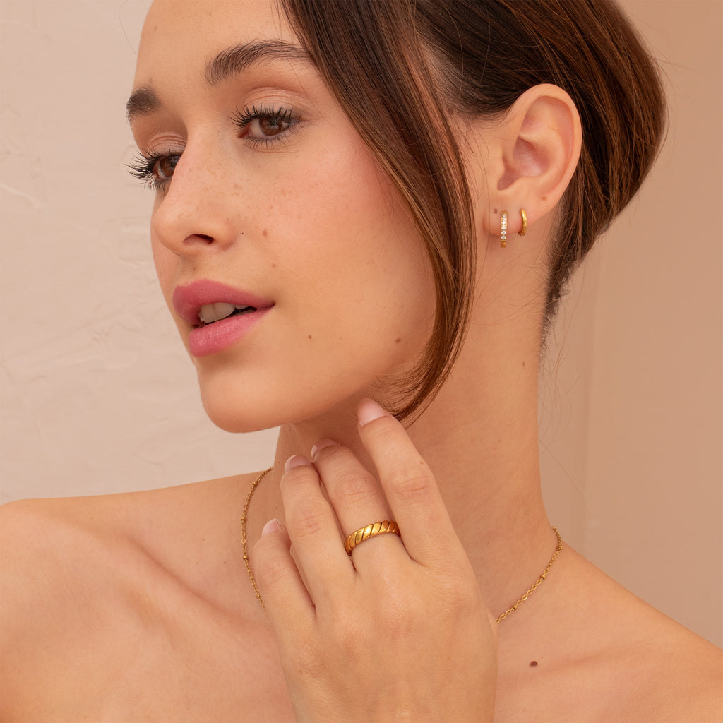 Ses délicates torsades dorées rappellent un design classique revisité avec une touche contemporaine. Cette bague est un choix parfait pour rehausser n’importe quelle tenue.